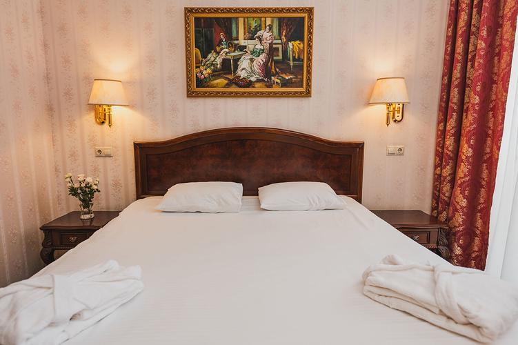 Четырехэтажное здание отеля стилизовано под дворянскую усадьбу ХIХ века с ярко выраженными отличительными чертами архитектуры того периода: массивные колонны, скульптуры, элементы из мрамора и богатое убранство интерьеров.